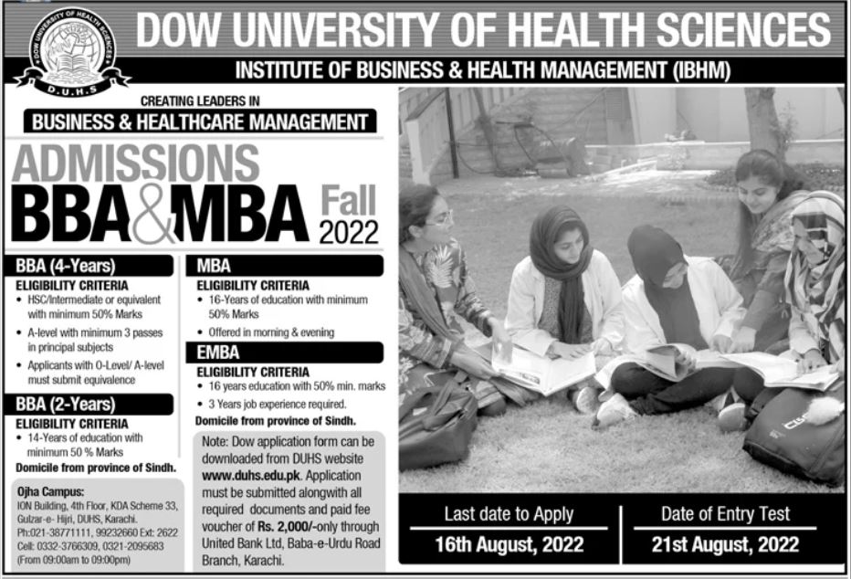 Dow University of Health Sciences BBA, MBA admissions 2022 has been started. Eligible students can apply for academic admissions 2022 in Dow University of Health Sciences Karachi Sindh Pakistan for Business MBA. Eligible candidates for admissions in BBA and MBA can apply as per Government institute criteria and before closing date 16 August 2022 after reading advertisement online. Read newspaper ad for exact details.