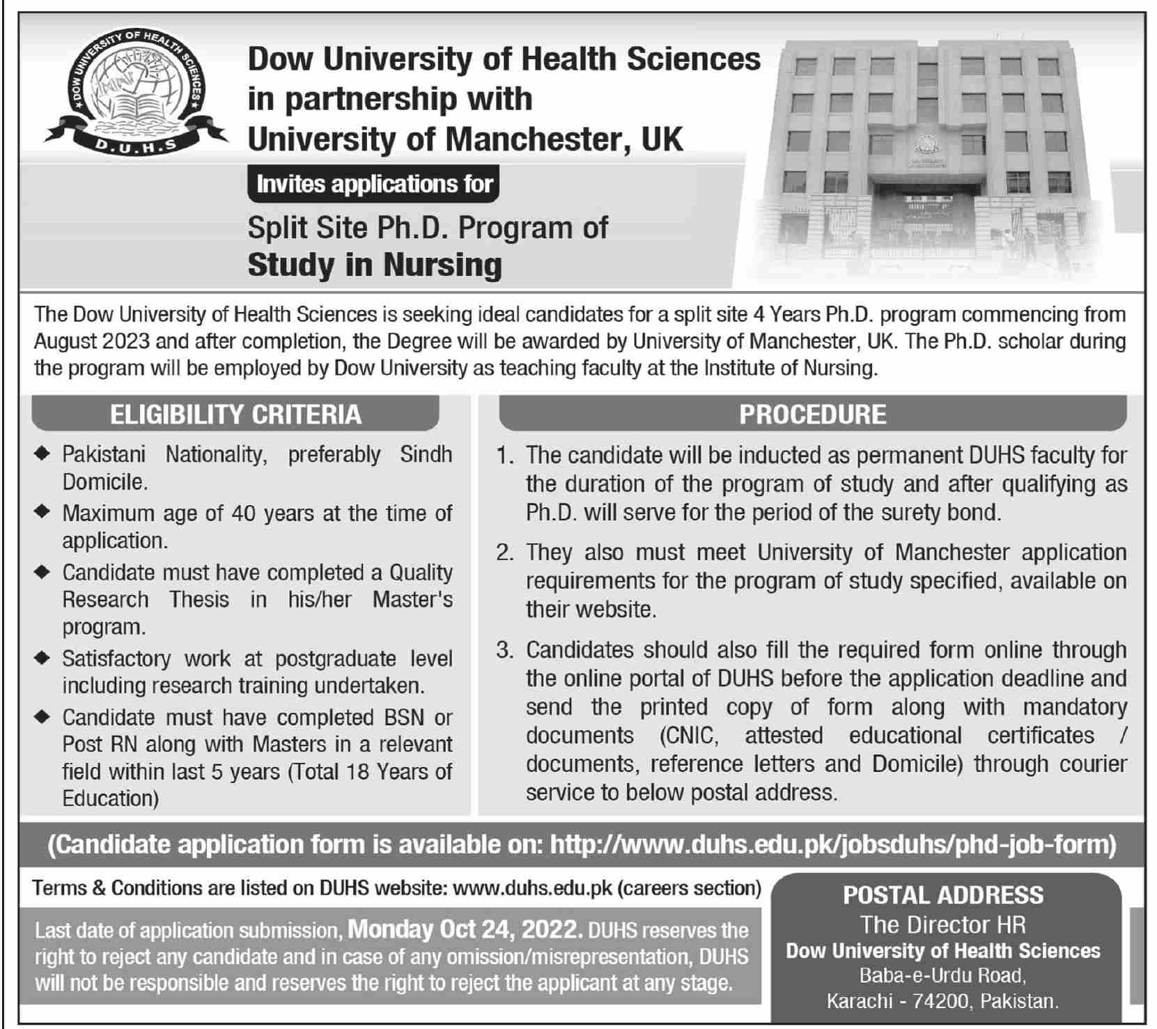 Admissions in Dow University of Health Sciences 2022 for PhD in Nursing, has been announced. Students who want to take admissions in Dow University of Health Sciences Karachi Sindh Pakistan for academic year 2022 to continue education in Medical University can apply. Students for admissions in Master can apply for online or campus classes as per Private institute criteria till admission closing date October 24, 2022. Read newspaper ad for exact details.