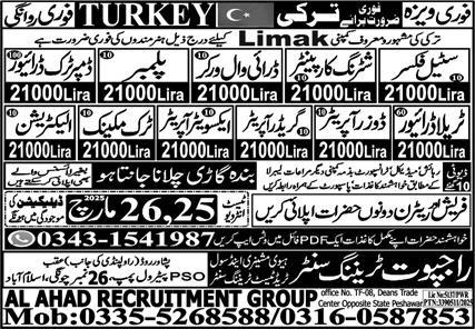 Rajput Training Center Istanbul, ankara Turkey invites applications from eligible candidates for the post of electrician, dumper truck driver, truck mechanic, dozer operator, steel fixer, driver, plumber, dry wall worker, excavator operator, triala driver, grader operator and shuttering carpenter as per advertisement of March 21, 2025 published in daily Express Newspaper. Preferred Education is DAE, Matric, Bachelor and Intermediate etc.