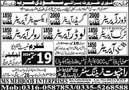 Rajput Training Center invites applications for job positions advertised in daily Express dated 13 September 2024 for following vacancies in Tabuk, taif Saudi Arabia.