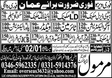 Vacant posts including ld mechanic, tyreman, dozer operator, hydraulic mechanic, welder, heavy diesel mechanic, lead mechanic, power electrician, mechanical helper, excavator operator, auto electrician and jcb operator are announced in Marmol Overseas Employment Muscat, muscat Oman as per 27 April 2024 advertisement in daily Express Newspaper. Preferred Education is Matric and Intermediate etc.