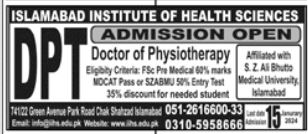 Admissions in Islamabad Institute of Health Sciences IIHS 2023 for Doctor of Physiotherapy DPT has been announced. Islamabad Institute of Health Sciences IIHS Islamabad Islamabad Pakistan welcomes students to apply for admissions in academic year 2023 in Medical AIOU. Students for admissions in DPT & criteria can apply as per Private institute admission policy 2023 before closing date January 15, 2024 as per advertisement. Read newspaper ad for exact details.