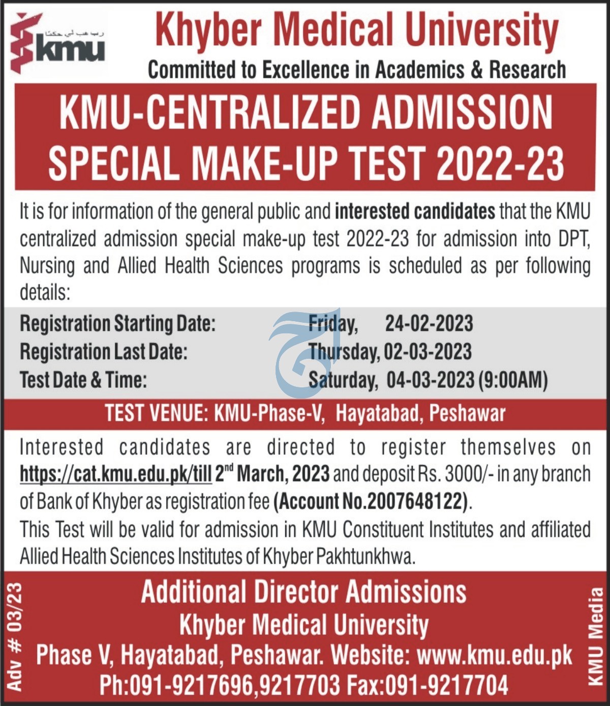 Khyber Medical University Peshawar Doctor of Physical Therapy DPT admissions 2023 has been announced. Students who want to take admissions in Khyber Medical University Peshawar Peshawar Khyber Pakhtunkhwa KPK Pakistan for academic year 2023 to continue education in Medical University can apply. Students for admissions in DPT can apply for online or campus classes as per Government institute criteria till admission closing date March 2, 2023. Read newspaper ad for exact details.