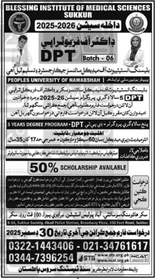 Blessing Institute of Medical Sciences BIMS dpt admissions 2025 has been announced. Students can enroll for admissions in Blessing Institute of Medical Sciences BIMS Karachi Sindh Pakistan for academic year 2025 to continue campus based or online education in Science College. Eligible candidates for admissions in can apply as per Government institute criteria and before closing date after reading advertisement online. Read newspaper ad for exact details.