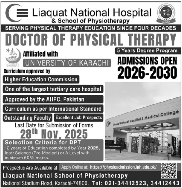 Liaquat National Hospital LNH admissions 2025 for DPT has been announced. Students who want to take admissions in Liaquat National Hospital LNH Karachi Sindh Pakistan for academic year 2025 to continue education in Science College can apply. Eligible students for fulfilling criteria for admissions in can enroll as per Government admission policy 2025 till closing date. Read newspaper ad for exact details.
