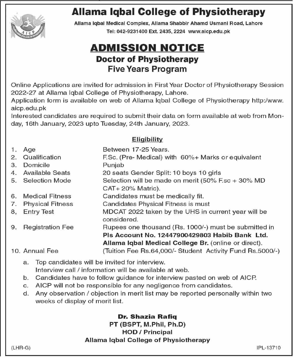 Allama Iqbal College of Physiotherapy AICP Doctor of Physiotherapy DPT admissions 2023 has been announced. Allama Iqbal College of Physiotherapy AICP Lahore Punjab Pakistan welcomes students to apply for admissions in academic year 2023 in Medical College. Eligible candidates for admissions in DPT can apply as per Government institute criteria and before closing date 24 January 2023 after reading advertisement online. Read newspaper ad for exact details.