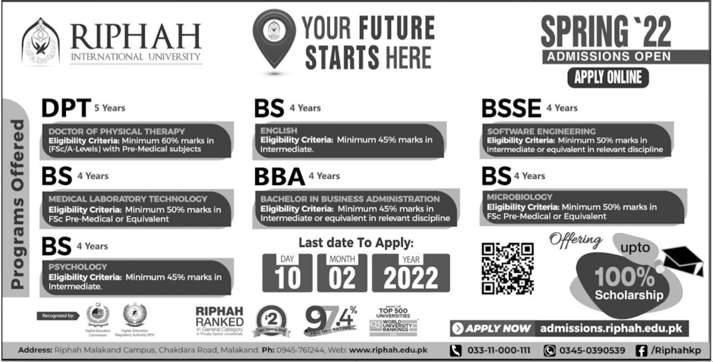 Admissions in Riphah International University 2022 for Doctor of Physical Therapy DPT, BS, BSSE, BS Medical Lab Technology, BBA, BS Microbiology, BS Psychology has been announced. Eligible students can apply for academic admissions 2022 in Riphah International University Malakand Khyber Pakhtunkhwa KPK Pakistan for Management University. Eligible candidates for admissions in DPT, BBA, Bachelor and BS can apply as per Private institute criteria and before closing date 10 February 2022 after reading advertisement online. Read newspaper ad for exact details.