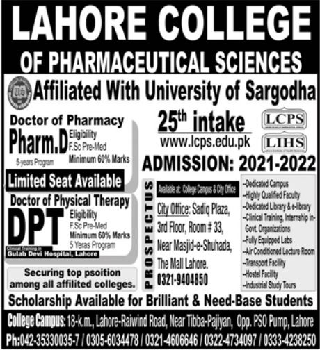 Admissions in Lahore College of Pharmaceutical Sciences LCPS 2022 for Doctor of Pharmacy Pharm D, Doctor of Physical Therapy DPT has been announced. Eligible students can apply for academic admissions 2022 in Lahore College of Pharmaceutical Sciences LCPS Lahore Punjab Pakistan for Medical College. Students for admissions in DPT and Pharm D can apply for online or campus classes as per Private institute criteria till admission closing date March 22, 2022. Read newspaper ad for exact details.