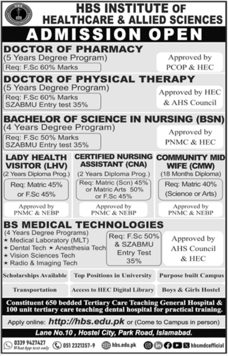 HBS Institute of Healthcare & Allied Health Sciences DPT admissions 2025 has been started. Students who want to take admissions in HBS Institute of Healthcare & Allied Health Sciences Lahore Punjab Pakistan for academic year 2025 to continue education in Science College can apply. Eligible students for fulfilling criteria for admissions in can enroll as per Government admission policy 2025 till closing date. Read newspaper ad for exact details.