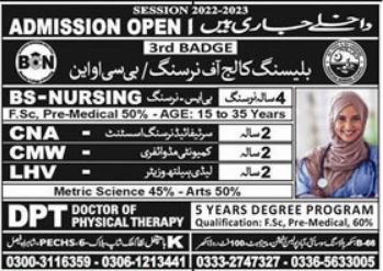 Admissions in Blessing College of Nursing 2023 for DPT, BSN, Certified Nursing Assistant CNA, Community Midwife CMW, Lady Health Visitor LHV has been announced. Students who want to take admissions in Blessing College of Nursing Karachi Sukkur Sindh Pakistan for academic year 2023 to continue education in Medical College can apply. Eligible students for fulfilling criteria for admissions in DPT, Diploma and BSN can enroll as per Private admission policy 2023 till closing date 2 May 2023. Read newspaper ad for exact details.