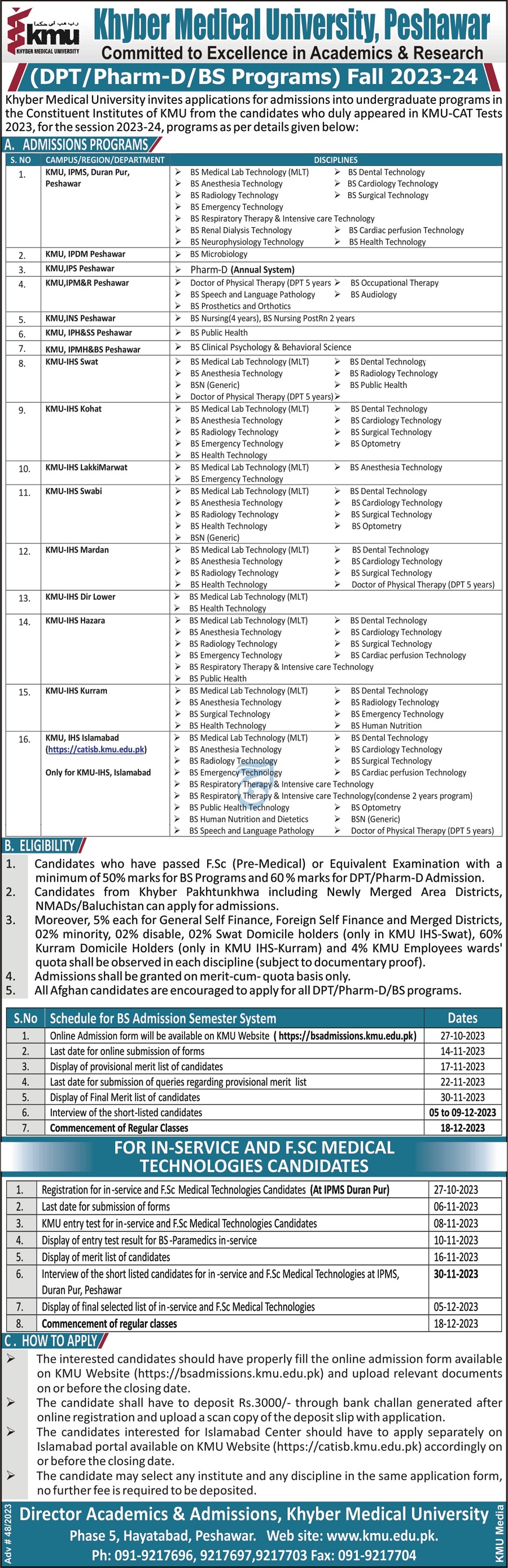 Khyber Medical University Peshawar DPT, Pharm D, BS admissions 2023 has been announced. Students who want to take admissions in Khyber Medical University Peshawar Peshawar Khyber Pakhtunkhwa KPK Pakistan for academic year 2023 to continue education in Science University can apply. Eligible students for fulfilling criteria for admissions in DPT, Pharm D and BS can enroll as per Government admission policy 2023 till closing date 14 November 2023. Read newspaper ad for exact details.