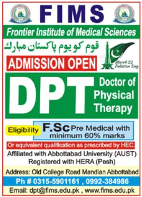 FIMS Frontier Institute of Medical Sciences admissions 2023 for Doctor of Physical Therapy DPT has been announced. Eligible students who qualify as per admission criteria in FIMS Frontier Institute of Medical Sciences Abbottabad Khyber Pakhtunkhwa KPK Pakistan can apply in Medical University for academic year 2023. Students who want to enroll for academic session 2023 in DPT qualification and admission criteria for Private institute can apply till last date 26 April 2023. Read newspaper ad for exact details.