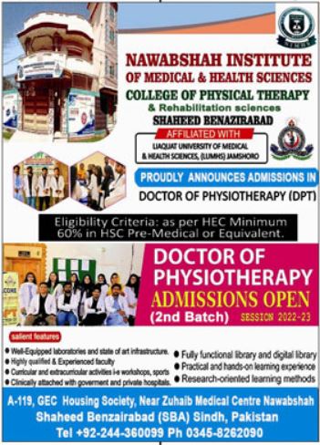 Nawabshah Institute of Medical and Health Sciences has announced admissions 2023 for Doctor of Physiotherapy DPT. Eligible students who qualify as per admission criteria in Nawabshah Institute of Medical and Health Sciences Nawabshah Sindh Pakistan can apply in Medical College for academic year 2023. Students who want to enroll for academic session 2023 in DPT qualification and admission criteria for Private institute can apply till last date 5 April 2023. Read newspaper ad for exact details.