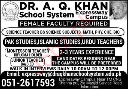 Latest DR A Q Khan School System Teaching Posts Rawalpindi 2025