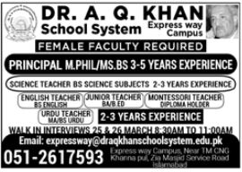 DR A Q Khan School System Islamabad, islamabad Islamabad Pakistan invites applications from eligible candidates for the post of urdu teacher, science teacher, principal, english teacher and montessori teacher as per advertisement of March 24, 2024 published in daily Jang Newspaper. Persons with Bachelor, B.ed, M.sc, Master and MA etc. education can apply.