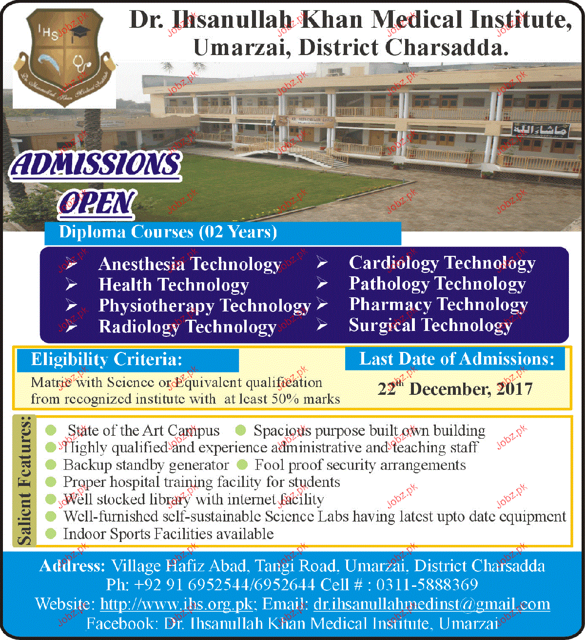 Dr Ihsanullah Khan Medical Institute Admission in Diploma in Cardiology Technology, Pharmacy Technology, Surgical Technology and Health Technology in Charsadda. Read newspaper ad for exact details.