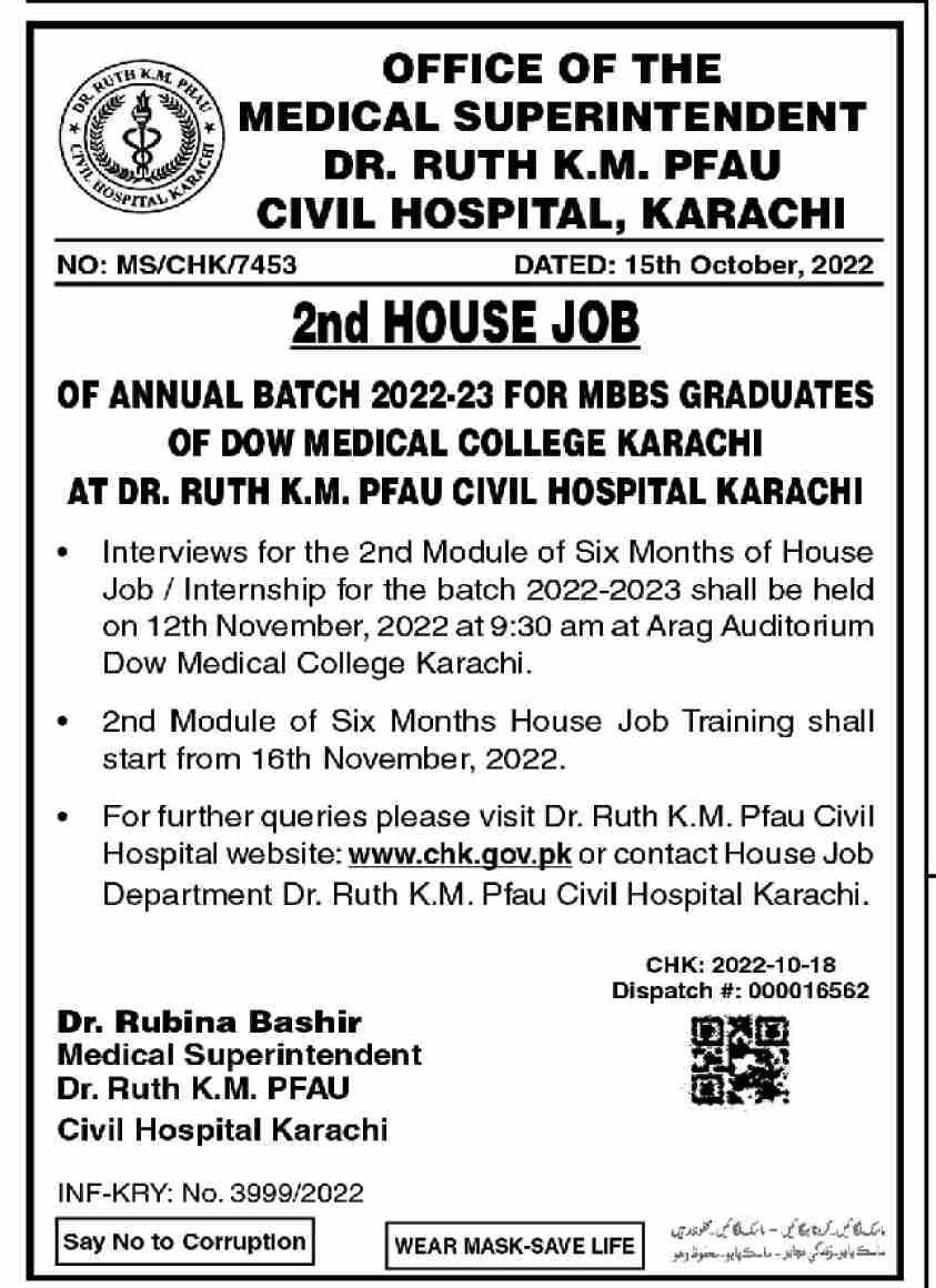 DR Ruth KM PFAU Civil Hospital 2nd House Job Jobs 2022