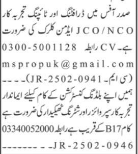 Vacant posts including draftsman, shuttering contractor, typist, admin clerk and supervisor are announced in Private Company Saddar Rawalpindi, rawalpindi Punjab Pakistan as per 1 March 2025 advertisement in daily Jang Newspaper. Intermediate, Matric, Bachelor and Middle etc. educational qualification will be preferred.