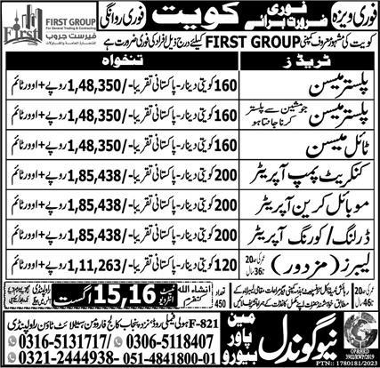 Vacant posts including coring machine operator, labor, drilling machine operator, concrete pump operator, plaster mason, mobile crane operator and tile mason are announced in New Gondal Manpower Bureau Kuwait, kuwait Kuwait as per 12 August 2023 advertisement in daily Express Newspaper. Matric and Intermediate etc. educational qualification will be preferred.