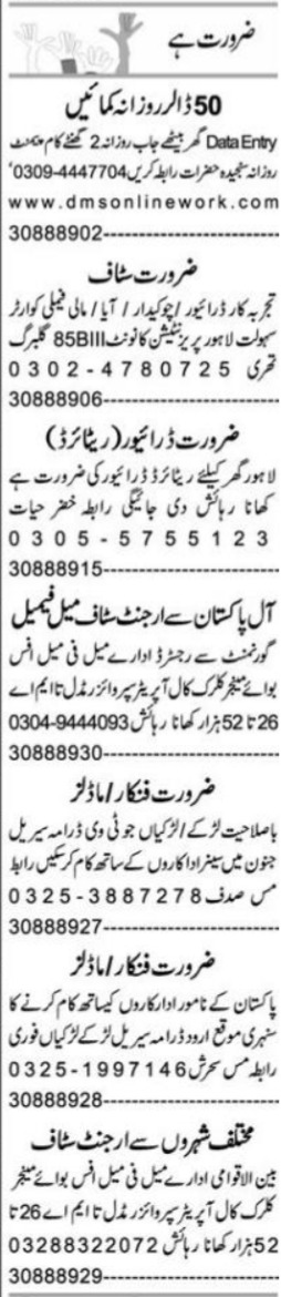 Private Company Lahore, lahore Punjab Pakistan invites applications from eligible candidates for the post of chowkidar, model, actor, clerk, driver, mali, aya, data entry operator, call operator, office boy, supervisor and manager as per advertisement of August 16, 2024 published in daily Express Newspaper. Educational qualifications required Bachelor, Master, Intermediate, Matric and Middle etc.
