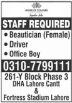 Vacant posts including beautician, driver and office boy are announced in Private Company Lahore, lahore Punjab Pakistan as per 17 July 2022 advertisement in daily Jang Newspaper. Persons with Primary, Matric and Middle etc. education can apply.