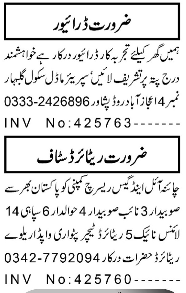 Private jobs advertisement dated about 19 October 2023 in daily Aaj Newspaper invites application for the vacant post of retired naib subedar, driver, retired sepoy, retired havaldar, retired patwari, retired wapda staff, retired teacher, retired subedar, retired lance naik and retired railway staff in Peshawar, peshawar Khyber Pakhtunkhwa KPK Pakistan. Preferred Education is Intermediate, Middle and Matric etc.