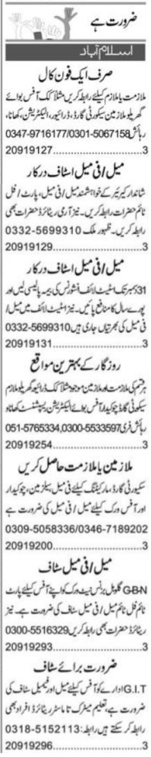 Vacant posts including office boy, cook, receptionist, electrician, salesman, male female staff, state life insurance staff, chowkidar, security guard, driver and house servant are announced in Private Islamabad, islamabad Islamabad Pakistan as per 15 December 2023 advertisement in daily Express Newspaper. Intermediate, Middle, Master, Bachelor, Matric and Primary etc. educational qualification will be preferred.
