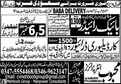 Mehboob Enterprises Overseas Employment Promoters latest Overseas Driving jobs and others can be applied till September 6, 2024 or as per closing date in newspaper ad. Read complete ad online to know how to apply on latest Mehboob Enterprises Overseas Employment Promoters job opportunities. Learn today extra skills including Motorcycle Courier, Driving and Delivery to get these Mehboob Enterprises Overseas Employment Promoters jobs. Salary varies from 111000. Overtime is allowed. Employer provides transport, accommodation and medical facility.