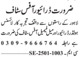 Driver & Female Office Staff Jobs 2025 In Lahore