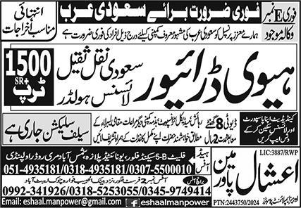 Eshaal Manpower Overseas Employment Promoters is looking for candidates for following posts as per job advertisement published in daily Express Newspaper of April 5, 2024 for location Riyadh, jeddah Saudi Arabia:
