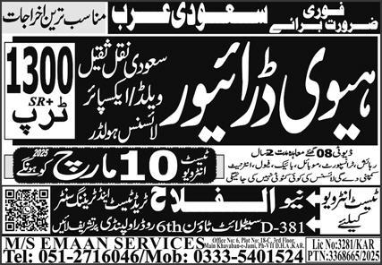 New Al Falah Trade Test & Training Center jobs advertisement dated about 5 March 2025 in daily Express Newspaper invites application for the vacant post of htv driver, heavy driver and driver in Riyadh, tabuk Saudi Arabia. Persons with Intermediate and Matric etc. education can apply.