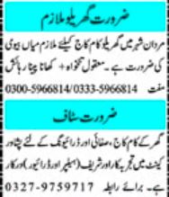House jobs advertisement dated about 18 May 2024 in daily Mashriq Newspaper invites application for the vacant post of helper, house worker, husband wife and driver in Peshawar, mardan Khyber Pakhtunkhwa KPK Pakistan. Primary and Middle etc. educational qualification will be preferred.
