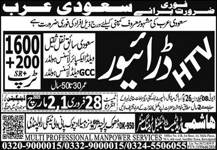 Vacant posts including htv driver and driver are announced in Hashmi Trade Test & Technical Training Center Dammam, taif Saudi Arabia as per 28 February 2025 advertisement in daily Express Newspaper. Candidates with Intermediate and Matric etc. educational background will be preferred.