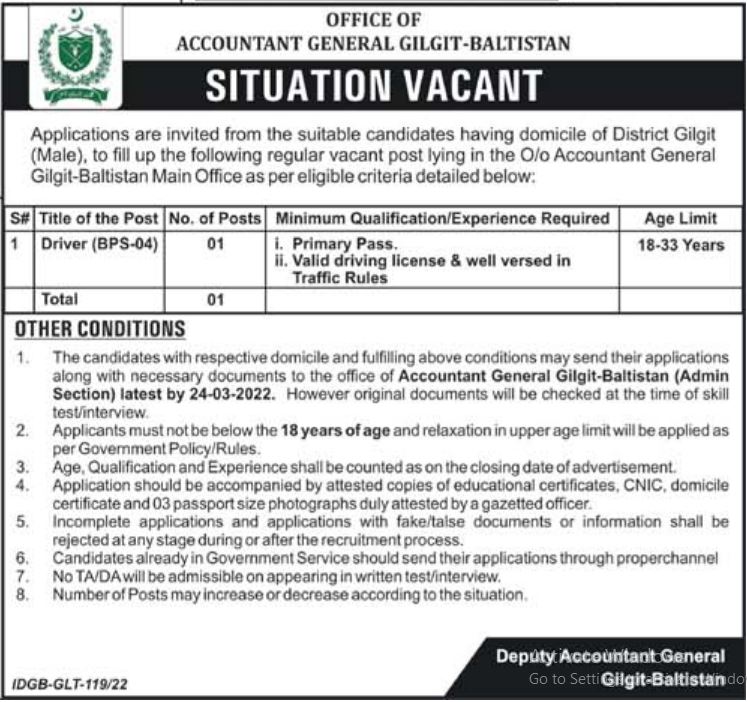 Office of Accountant General Gilgit, gilgit Gilgit Baltistan Pakistan invites applications from eligible candidates for the post of driver as per advertisement of March 5, 2022 published in daily Mahasib Newspaper. Educational qualifications required Primary etc.