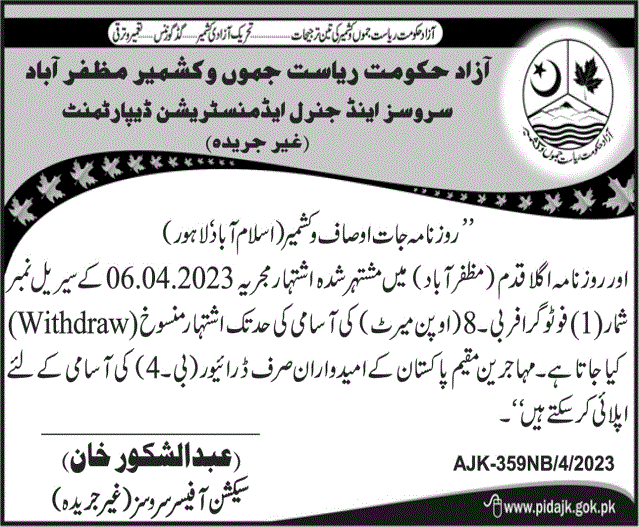 Services & General Administration Department is looking for candidates for following posts as per job advertisement published in daily Ausaf Newspaper of April 13, 2023 for location Muzaffarabad, muzaffarabad AJK Pakistan:
