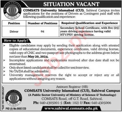 Comsats University Islamabad, islamabad Islamabad Pakistan invites applications from eligible candidates for the post of driver as per advertisement of May 5, 2024 published in daily Nation Newspaper. Preferred Education is Matric etc.