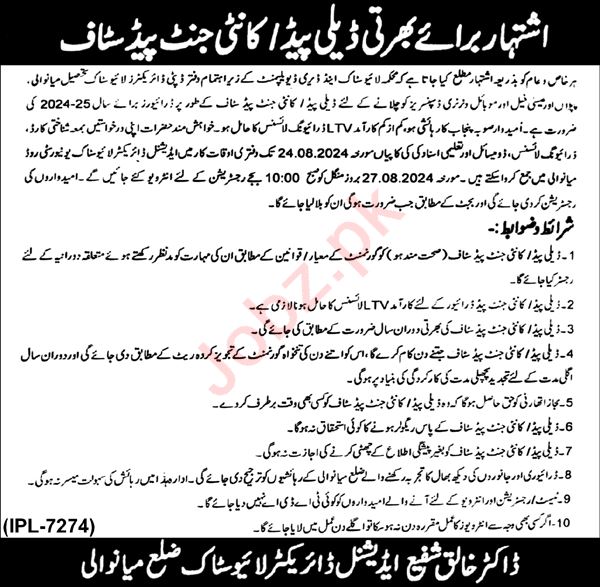 Vacant posts including driver are announced in Livestock and Dairy Development Department Mianwali, mianwali Punjab Pakistan as per 4 August 2024 advertisement in daily Nawaiwaqt Newspaper. Educational qualifications required Middle etc.