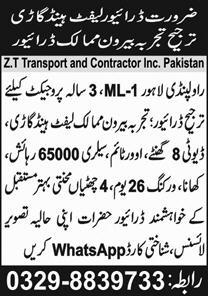 ZT Transporter & Contractor Rawalpindi, rawalpindi and lahore Punjab Pakistan invites applications from eligible candidates for the post of left hand driver as per advertisement of January 7, 2025 published in daily Express Newspaper. Persons with Middle etc. education can apply.