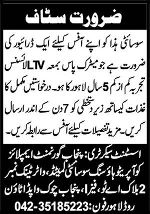 Employees Cooperative Housing Society jobs advertisement dated about 23 February 2022 in daily Nawaiwaqt Newspaper invites application for the vacant post of ltv driver and driver in Lahore, lahore Punjab Pakistan. Educational qualifications required Matric etc.