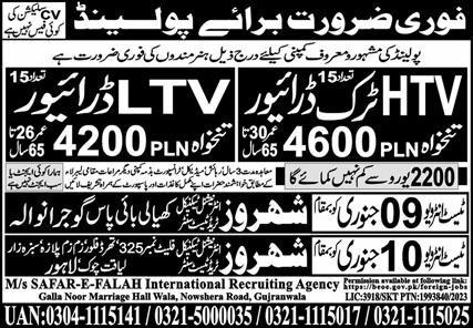 Safar e Falah International Recruiting Agency jobs advertisement dated about 6 January 2024 in daily Express Newspaper invites application for the vacant post of ltv driver and htv truck driver in Warsaw, warsaw Poland. Educational qualifications required Intermediate, Middle, Matric and Primary etc.