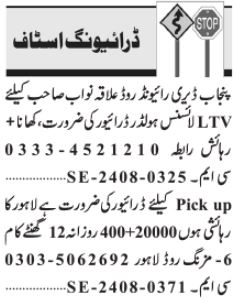 Vacant posts including driver and ltv driver are announced in Private Company Lahore, lahore Punjab Pakistan as per 10 August 2024 advertisement in daily Jang Newspaper. Matric and Middle etc. educational qualification will be preferred.