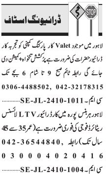 Private Company jobs advertisement dated about 29 October 2024 in daily Jang Newspaper invites application for the vacant post of house driver, ltv driver and driver in Lahore, lahore Punjab Pakistan. Persons with Middle and Matric etc. education can apply.