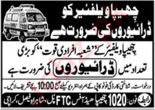 Chhipa Welfare jobs advertisement dated about 27 April 2025 in daily Jang Newspaper invites application for the vacant post of driver in Shah Faisal Colony Karachi, karachi Sindh Pakistan. Candidates with Primary and Middle etc. educational background will be preferred.