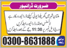 Driver Required At House Duty In Multan