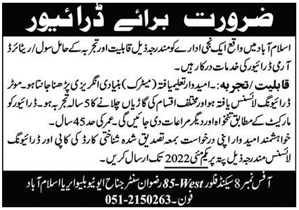 Private Firm jobs advertisement dated about 18 April 2022 in daily Express Newspaper invites application for the vacant post of driver in Islamabad, islamabad Islamabad Pakistan. Preferred Education is Matric etc.