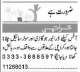 Latest Classifieds jobs in Private Office in Driving and others can be applied till NaN undefined NaN or as per closing date in newspaper ad. Read complete ad online to know how to apply on latest Private Office job opportunities.