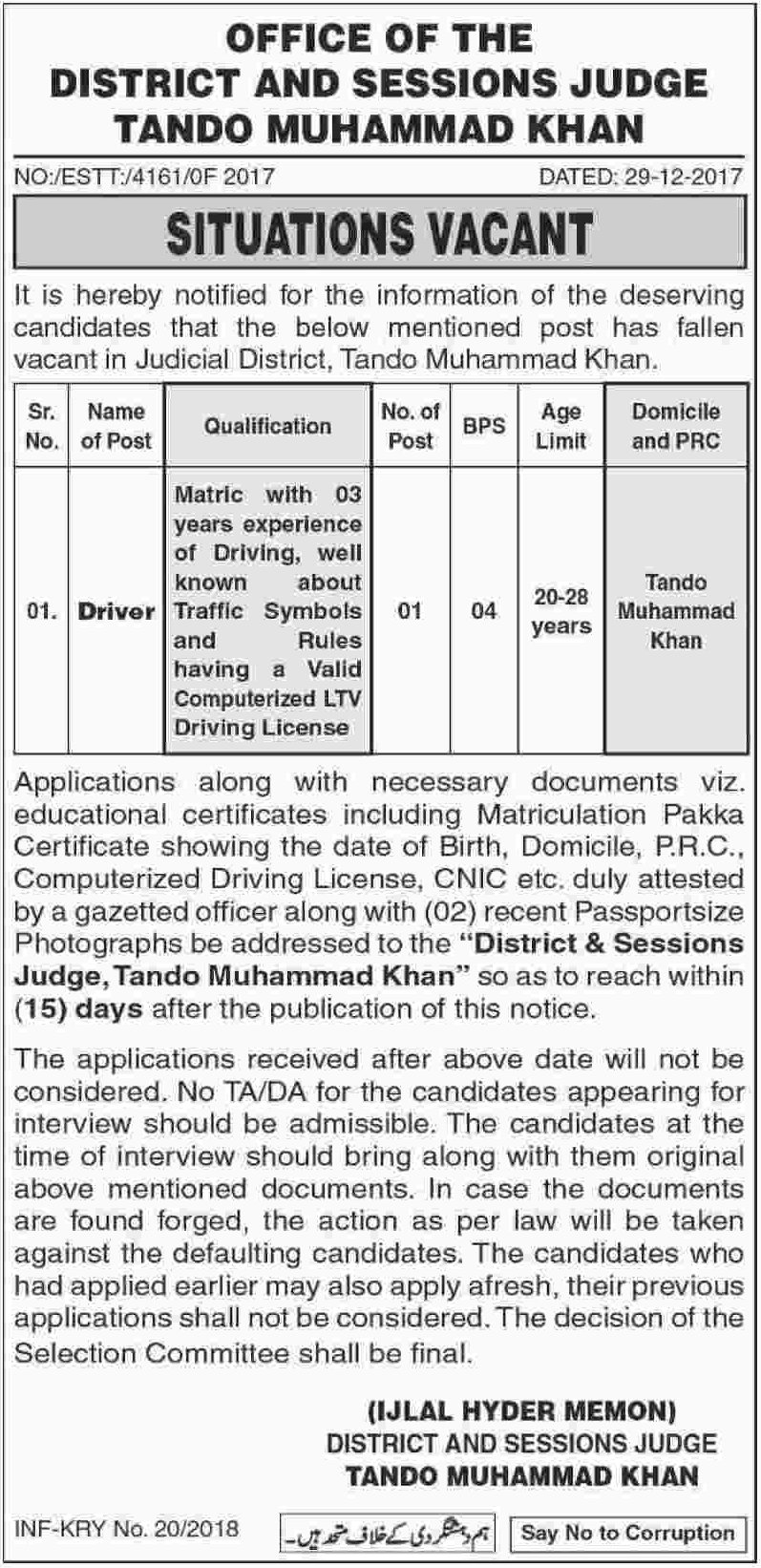 Latest District and Session Judge Driving Posts Tando Allahyar 2025