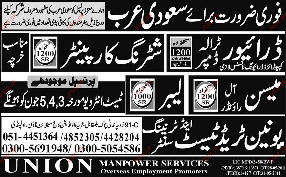 Driver, Shuttering Carpenter, Mason Job Opportunity