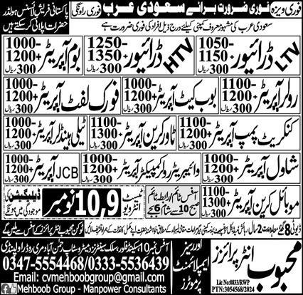 Mehboob Enterprises Overseas Employment Promoters Saudi Arabia, saudi arabia Saudi Arabia invites applications from eligible candidates for the post of Ltv Driver, Roller Operator, Tower Crane Opeator, Jcb Operator, Boom Operator, Tele Handler Operator, Bob Cate Operator and Htv Driver as per advertisement of November 3, 2024 published in daily Express Newspaper. Candidates with Bachelor, Intermediate, DAE, Middle and Matric etc. educational background will be preferred.