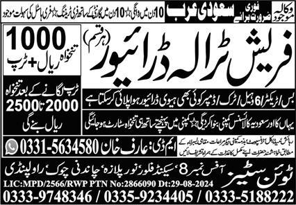 Latest Driving jobs and others Overseas jobs in Twin Cities International Overseas Employment closing date is around December 19, 2024, see exact from ad. Read complete ad online to know how to apply on latest Twin Cities International Overseas Employment job opportunities. Salary varies from 185000. Earn more by overtime. During job medical, accommodation and transport facility is available.